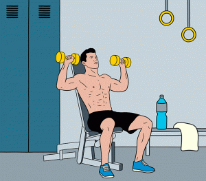 Dumb bell shoulder press 1. Sit at the bench while straight your back. 2. Hold dumb bell 90 degree from your arms while open arms butterfly position. 3. Lift up your arms straight on your center head 4. Return slowly next position. EXERCISE. whole shoulder.