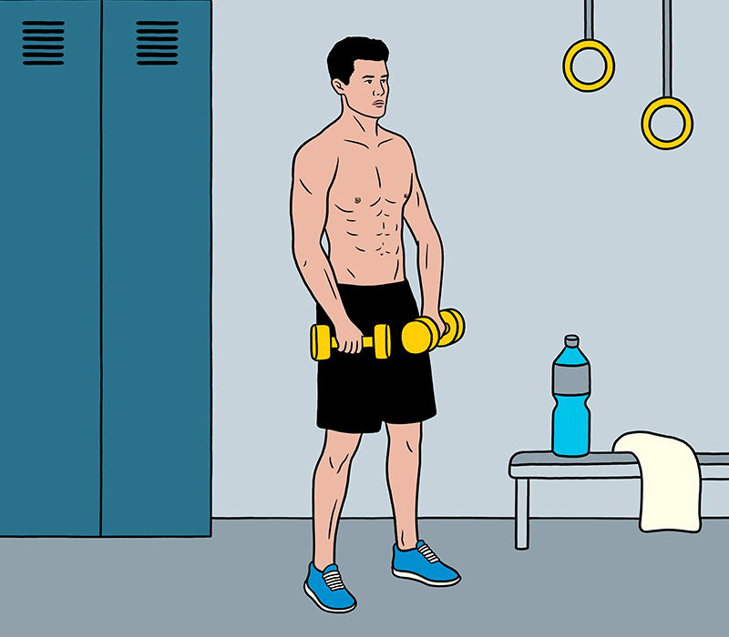 Dumb bell front raise 1.Stance your foot your shoulder distance & hold dumb bell while facing your back hand forwarding front. 2. Set position your hand over your front thigh 3. lift dumb bell to front side until your shoulder height while straight your arms 4. Return slowly next position. EXERCISE. Front triangle muscle.
