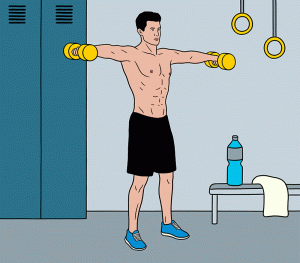 Dumb bell side lateral raise 1. Stance your foot your shoulder distance & hold dumb bell while facing your back hand forwarding both side. 2. Set position your hand over your both side of thigh 3. lift dumb bell to both side until your shoulder height while slight vent your arms. 4. Return slowly next position. EXERCISE. Side triangle muscle.