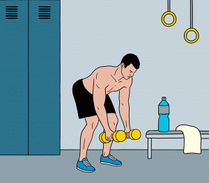 Dumb bell vent over raise 1. Stance your foot your shoulder distance & hold dumb bell while vent your back 90 degree. 2. Set position your hand under your knee. 3. lift dumb bell to both side until your shoulder height while slight vent your arms. 4. Return slowly next position. EXERCISE. Back triangle muscle.